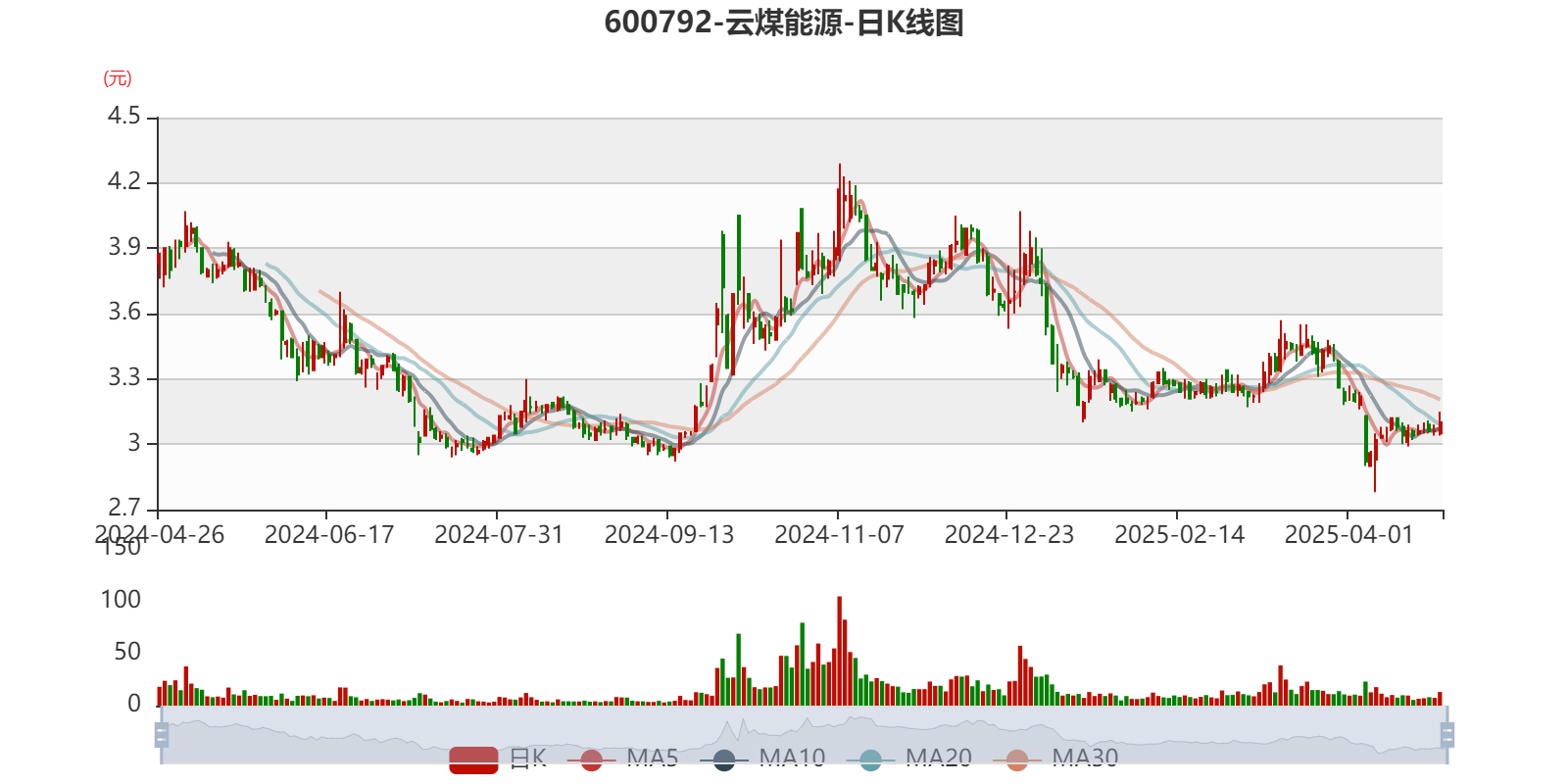 以4月25日收盘价计算,云煤能源目前市盈率(TTM)约为-5.45倍,市净率(LF)约1.17倍,市销率(TTM)约0.56倍。