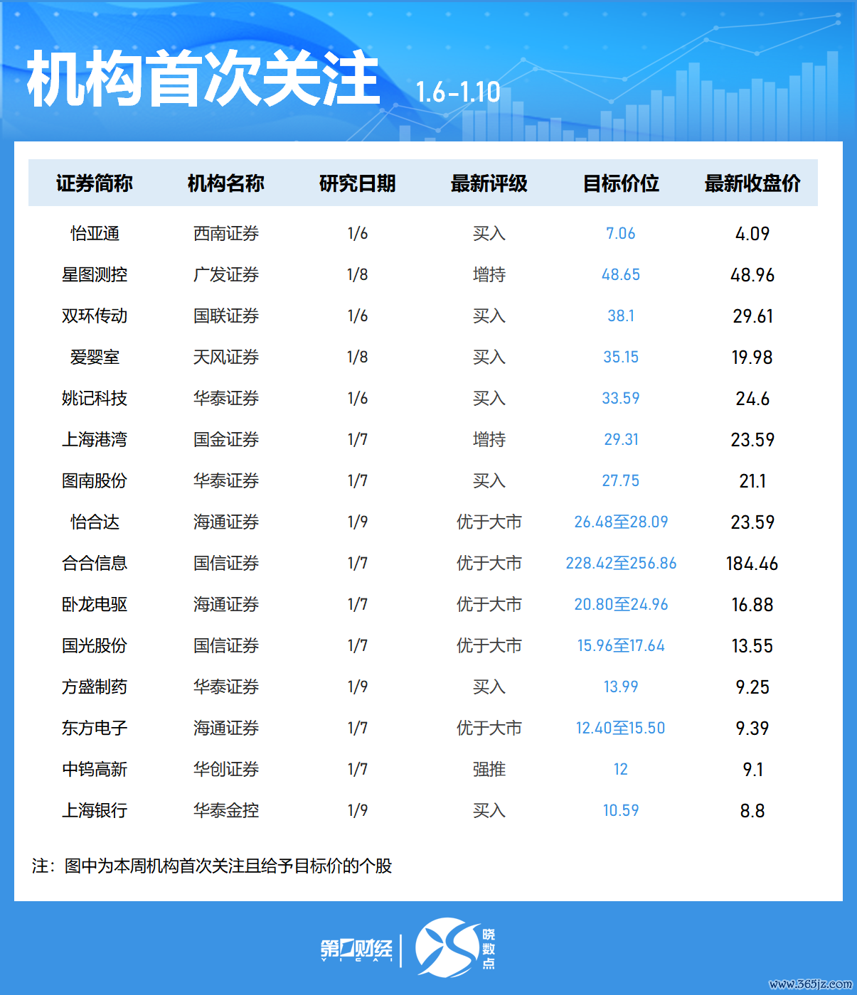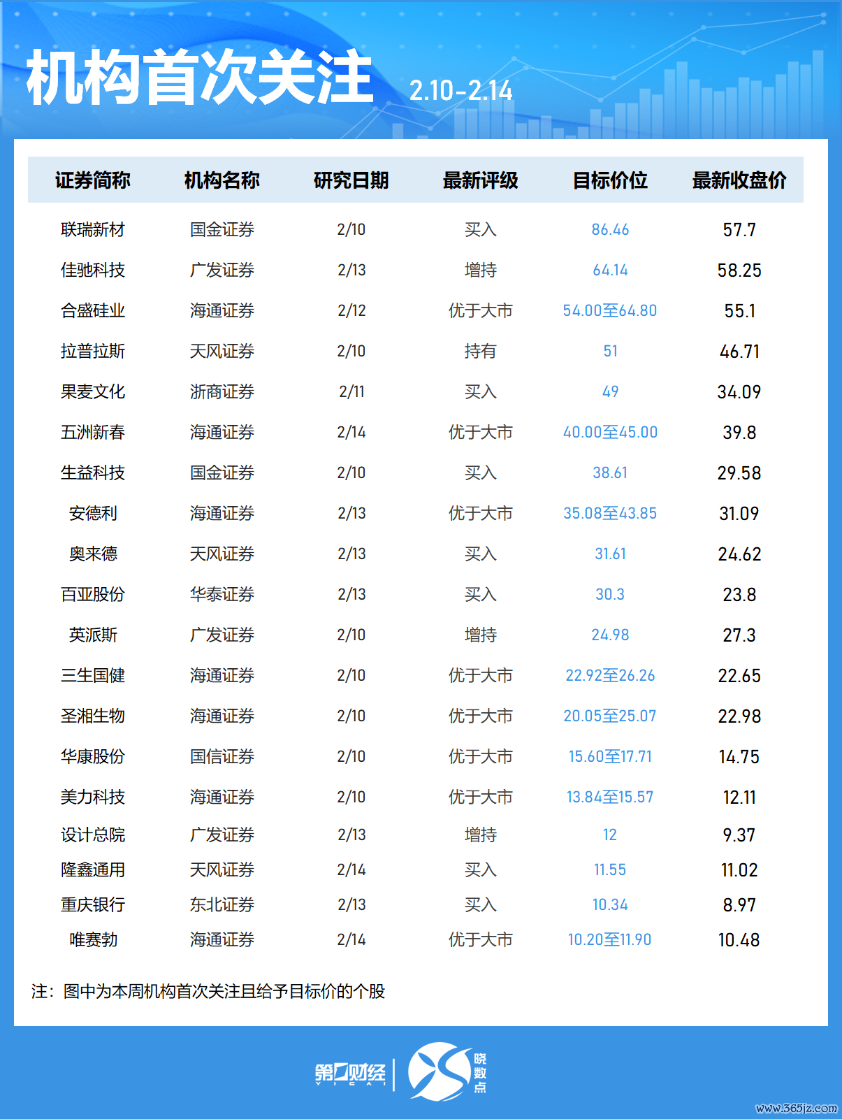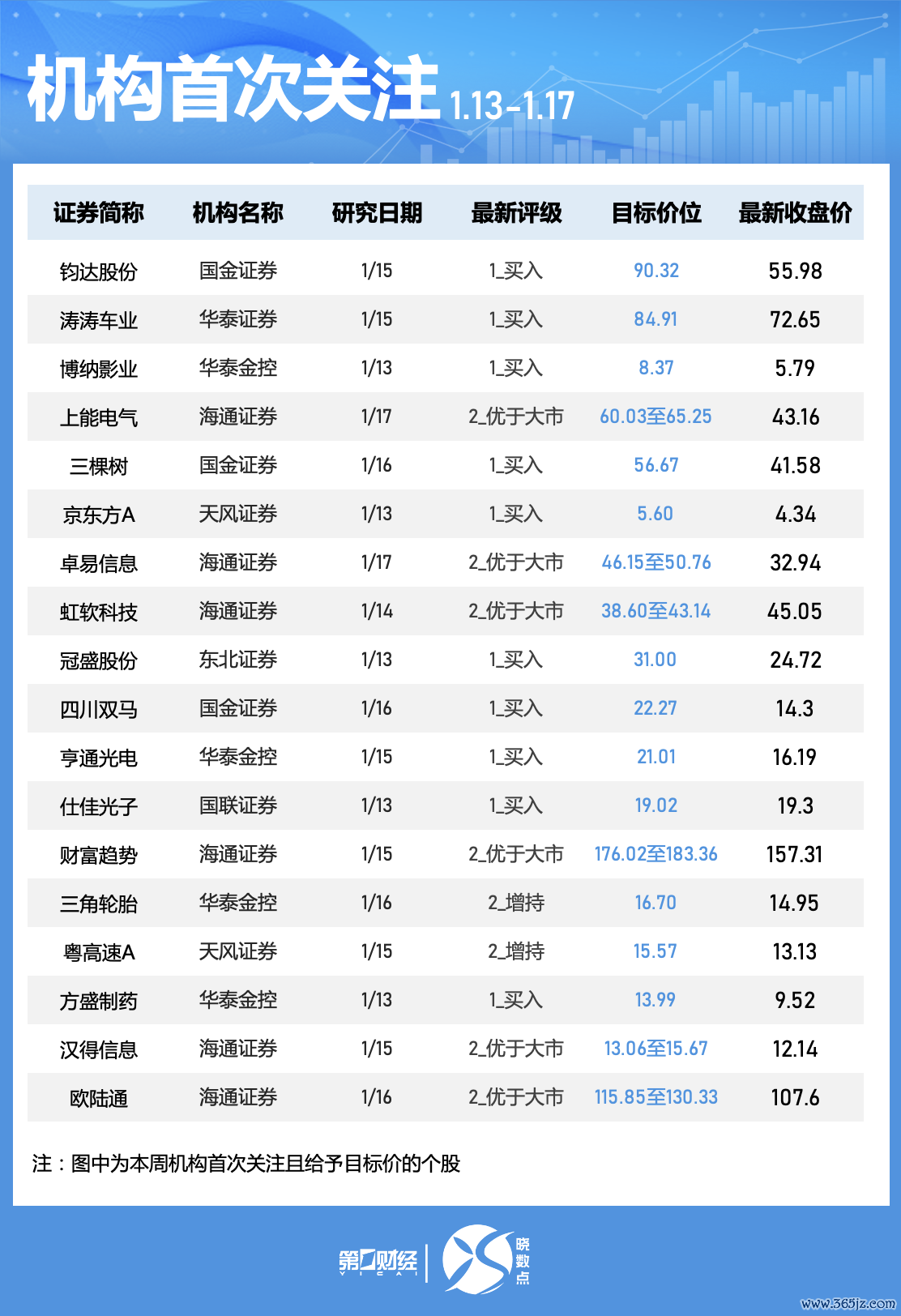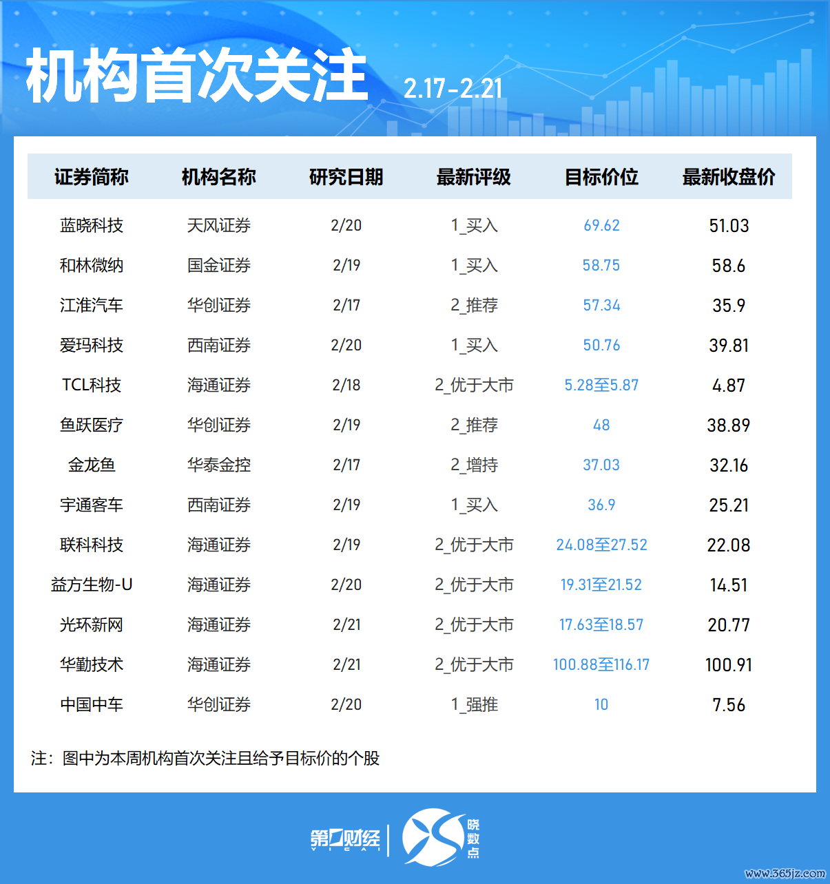 Wind数据显示,机构本周首次关注151只个股,11股被给予目标价。-赛力斯获天风证券看好,被给予目标价167.7元,该股最新收盘价为128.99元;-海博思创获平安证券、天风证券青睐正规配资,天风证券给予其目标价82.53元;,-西部超导获3家机构看好,光智科技、华工科技、东华测试、上海电影、银轮股份、湖南黄金等均获2家机构青睐。