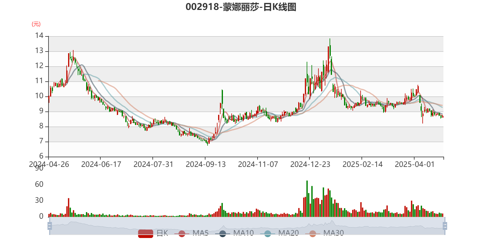中证智能财讯蒙娜丽莎(002918)4月26日披露2025年第一季度报告。公司实现营业总收入6.86亿元,同比下降16.12%;归母净利润亏损5928.14万元,上年同期盈利963.5万元;扣非净利润亏损6750.24万元,上年同期盈利876.97万元;经营活动产生的现金流量净额为-1.14亿元,上年同期为2787.04万元;报告期内,蒙娜丽莎基本每股收益为-0.15元,加权平均净资产收益率为-1.79%。