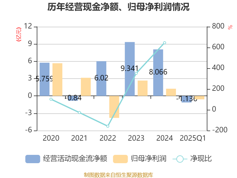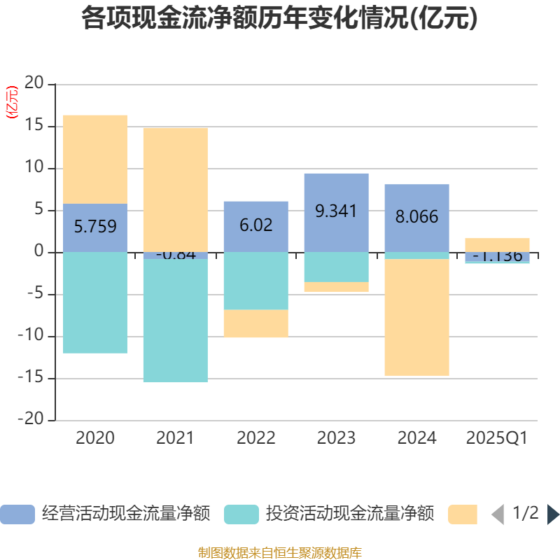 截至2025年一季度末,公司经营活动现金流净额为-1.14亿元,同比减少1.41亿元;筹资活动现金流净额1.65亿元,同比增加2.15亿元;投资活动现金流净额-2304.26万元,上年同期为-2656.3万元。