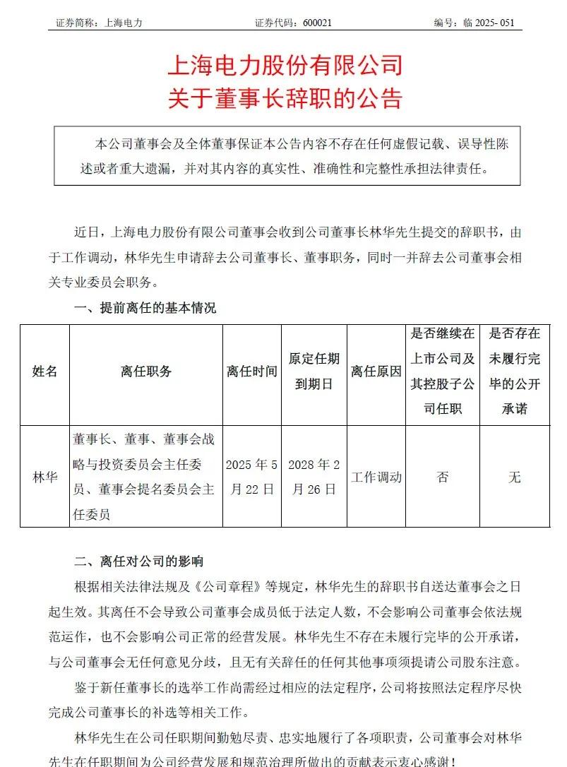 5月23日,上海电力股份有限公司(简称上海电力)公告称,近日,公司董事会收到董事长林华提交的辞职书,由于工作调动,林华申请辞去公司董事长、董事职务,同时一并辞去公司董事会相关专业委员会职务。